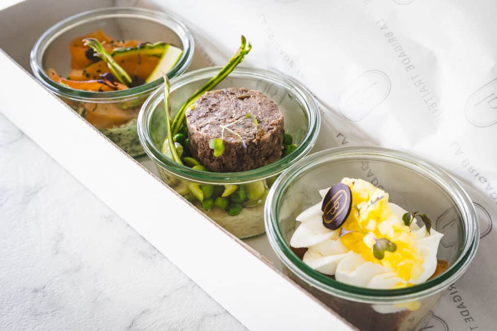 Profitez d'un format hybride avec un cocktail en format entrée, plat et dessert servis dans des bocaux consignés pour allier confort et praticité.