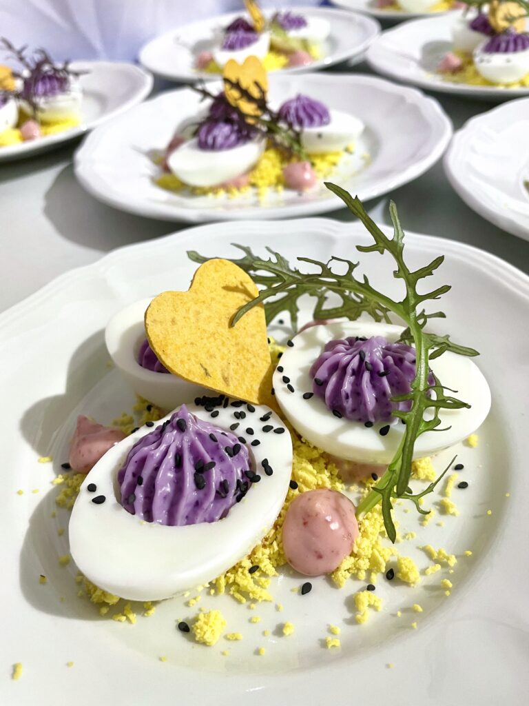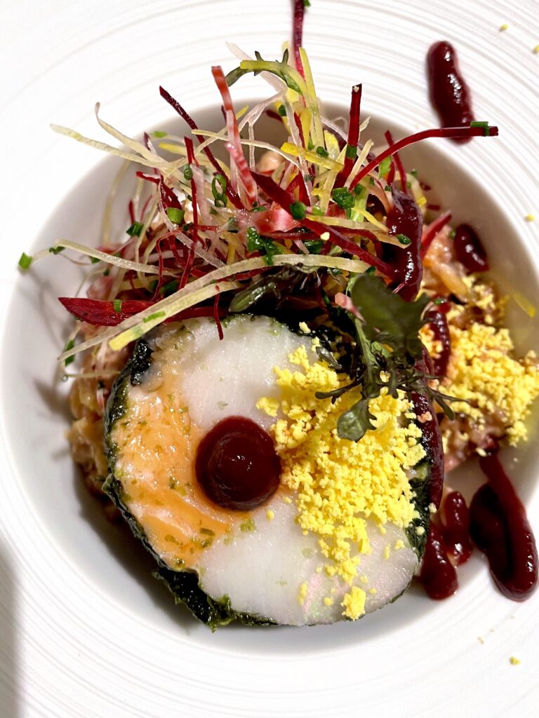 Ensuite, place au repas. À votre arrivée en salle, Tweedledum et Tweedledee vous accueillent avec leur entrée préférée : un trio d’oeufs mimosa revisités.